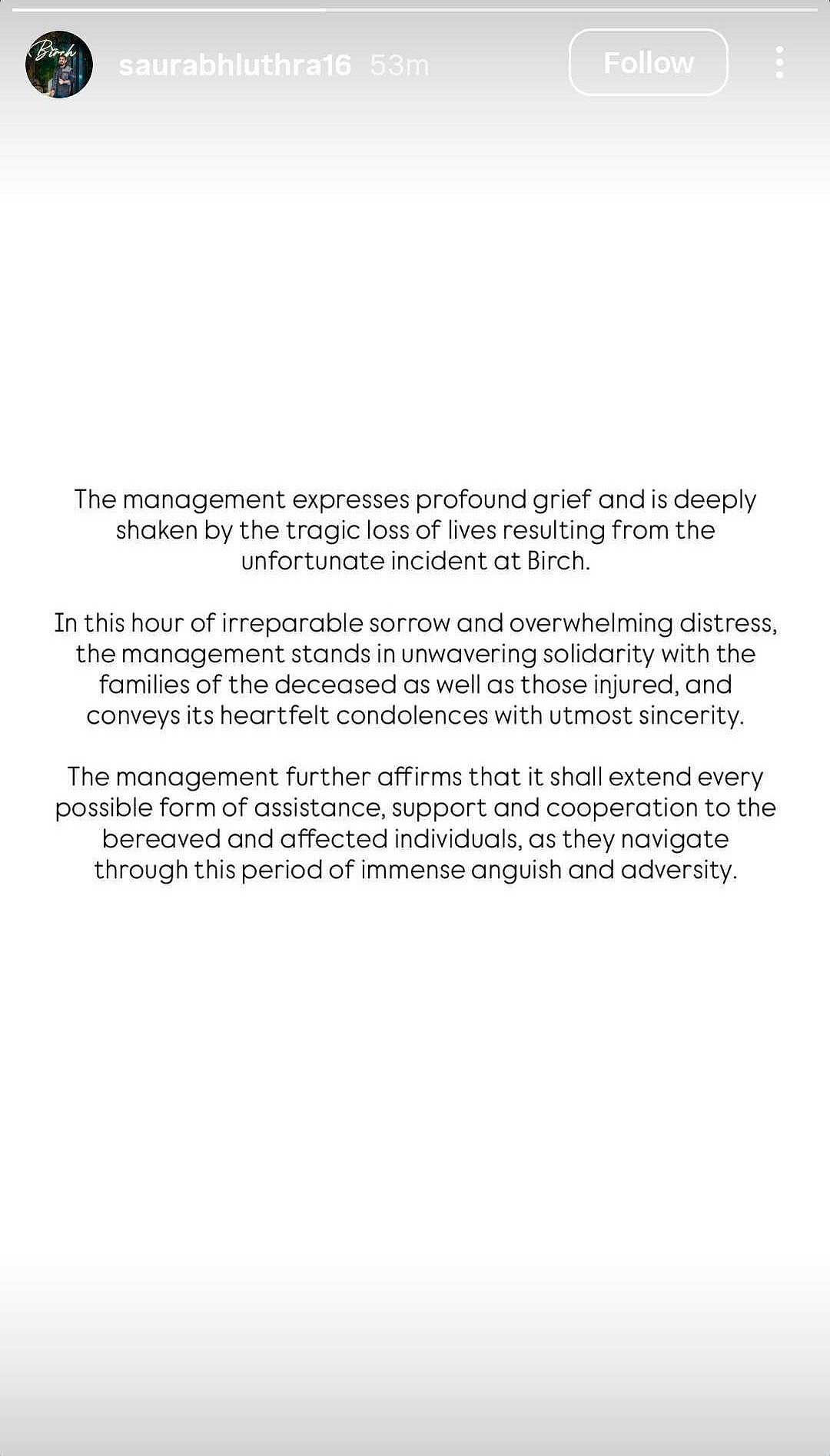 In a statement shared on Instagram, Luthra said the management was “deeply shaken by the tragic loss of lives” in the incident at Birch. “The management expresses profound grief and is deeply shaken by the tragic loss of lives resulting from the unfortunate incident at Birch,” he said, adding that the organisation stood in solidarity with the families of those who died or were injured and would extend “every possible form of assistance, support and cooperation”.