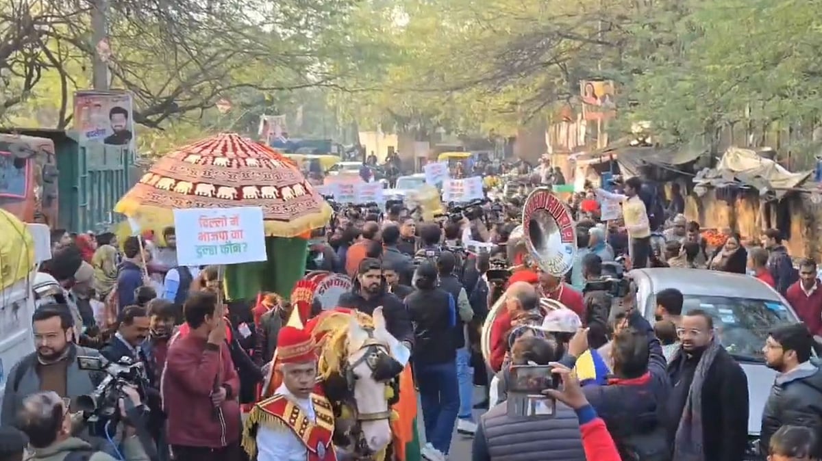 The "Bin Dulhe Ki Barat", complete with a bedecked horse without a groom and a band party playing ceremonial music, was taken out from Todapur in the New Delhi Assembly segment, being contested by AAP supremo Arvind Kejriwal. Former Delhi mayor Shelly Oberoi also took part in the procession.