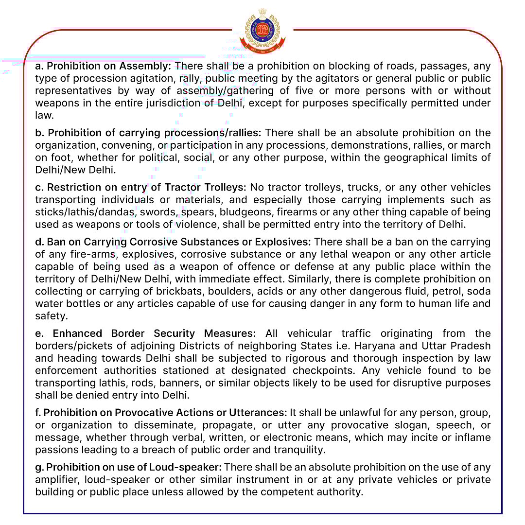 Delhi Police has taken precautionary steps by implementing Section 144 across the city in anticipation of the farmers' Delhi Chalo March scheduled for Tuesday. The directive, issued by Delhi Police Commissioner Sanjay Arora on Monday, aims to maintain law and order during the protest in and around the national capital.