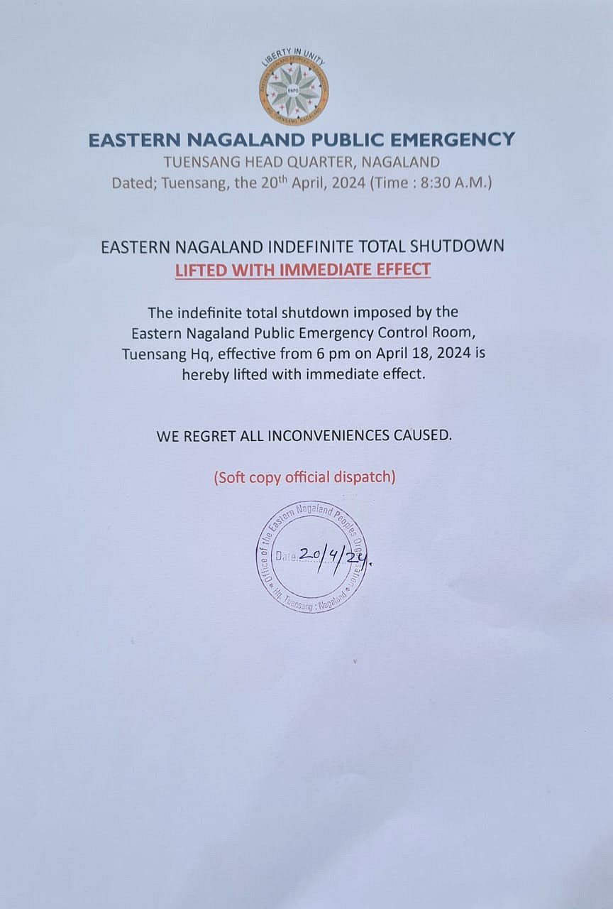 "The indefinite total shutdown imposed by the Eastern Nagaland Public Emergency Control Room, Tuensang Hq, effective from 6 pm on April 18, 2024 is hereby lifted with immediate effect. We Regret All Inconveniences Caused," read the statement.