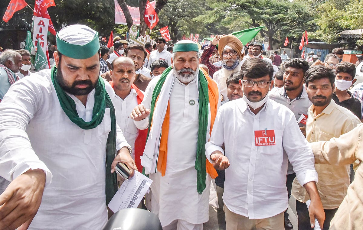 Bharatiya Kisan Union (BKU) leader Rakesh Tikait along with farmers attend Kisan Sansad during a protest against the three farm laws amid the Monsoon session of the Parliament, in New Delhi | ANI