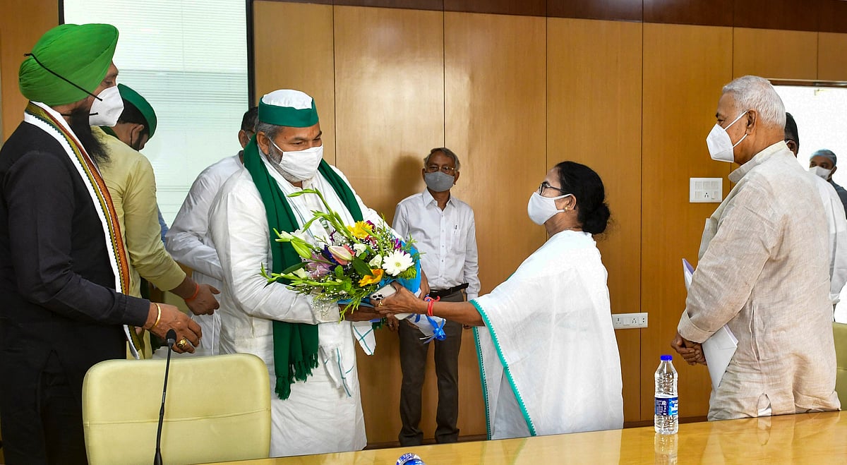 Kolkata: Bharatiya Kisan Union (BKU) leaders Rakesh Tikait and Yudhvir Singh met West Bengal Chief Minister Mamata Banerjee to seek her support in the ongoing farmers' protest against the BJP-led Central government’s farm laws.