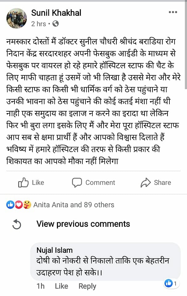 Even before the FIR was lodged Dr Sunil Choudhary (with the profile Sunil Khakhal) issued an apology on Facebook which reads, “I apologise for the chat of my hospital staff that is going viral on social media. My staff and I have never had intentions to harm the religious sentiments of any religious community. We have no intention of denying treatment to any community. If you have felt hurt by what happened, my staff and I apologise to you. We wish to emphasise that the hospital will not give you any cause of complaint.”