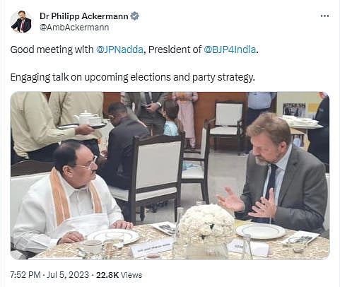German ambassador to India, Dr Philipp Ackermann, had to delete a tweet about his meeting with BJP chief JP Nadda and post an edited version after the previous one went viral for all the wrong reasons.