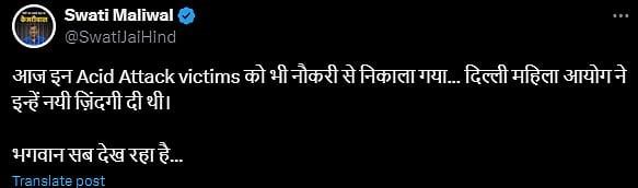 Former Delhi Commission for Women chief Swati Maliwal on Thursday slammed Lieutenant Governor Vinai Kumar Saxena's move to approve the sacking of 223 DCW employees, including women acid attack survivors on grounds that their employment is “irregular” and “illegal”. Maliwal, in a tweet on X, said, "Today these acid attack victims were also fired from their jobs… Delhi Women's Commission had given them a new life. God is watching everything."