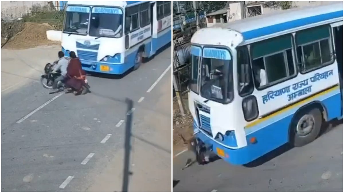 The video shows a Haryana Roadways bus moving on what appears to be the main road when a bike tried to cross the road without noticing the vehicle. The incident took place on November 18 at around 1:20 pm.