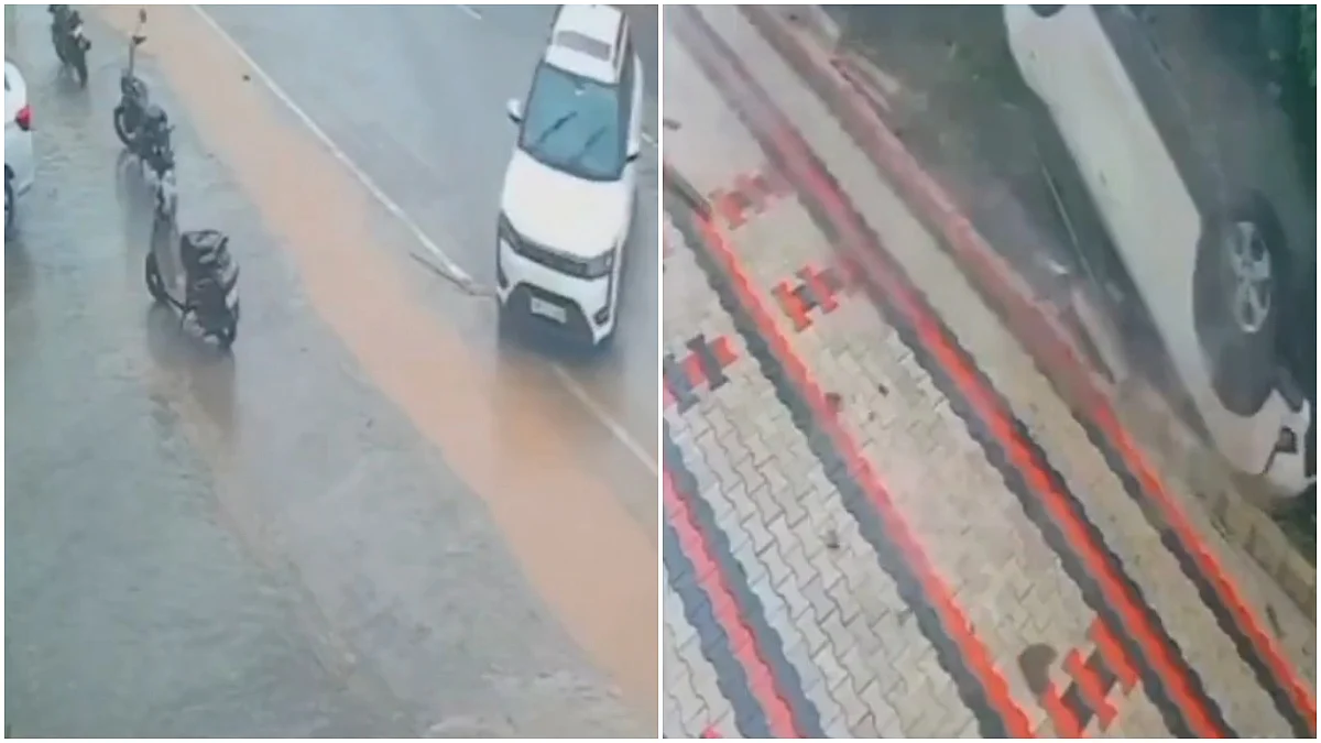 Bilaspur: A disturbing video surfaced from Himachal Pradesh's Bilaspur, where a speeding car skidded off the road amid heavy rains in the state on Wednesday. The Incident was recorded on CCTV, and the video soon went viral on social media.