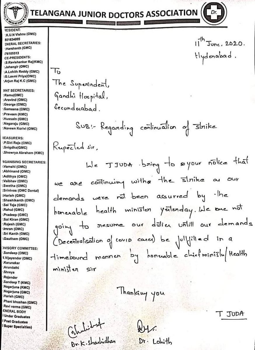Over 300 junior doctors in Hyderabad's Gandhi hospital who had on Wednesday refused to resume their duties after a deceased COVID-19 patient's family trashed an on-duty doctor with an iron stool, have on Thursday written to the Superintendent of the hospital and said that they will be continuing their strike.