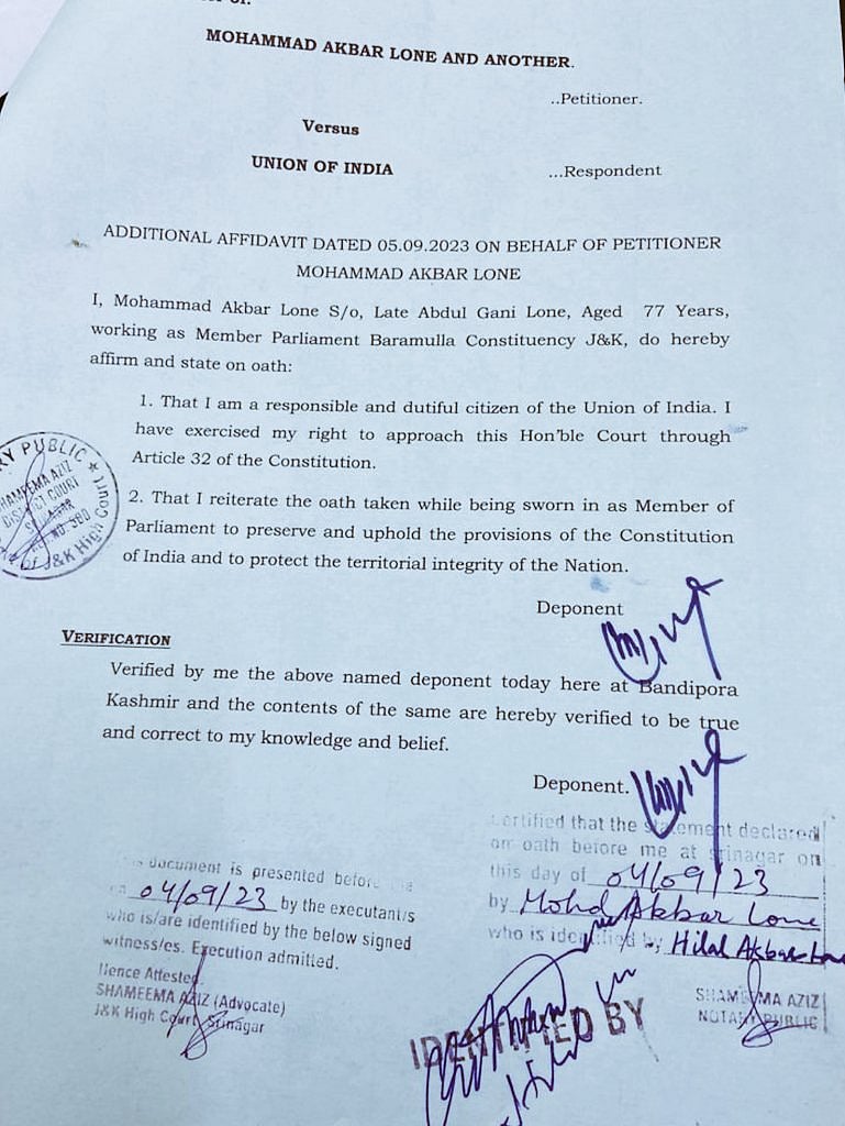 In his affidavit on Tuesday, Lone said: "1. Mohammad Akbar Lone S/o, Late Abdul Gani Lone, Aged 77 Years, working as Member Parliament Baramulla Constituency J&K, do hereby affirm and state on oath: