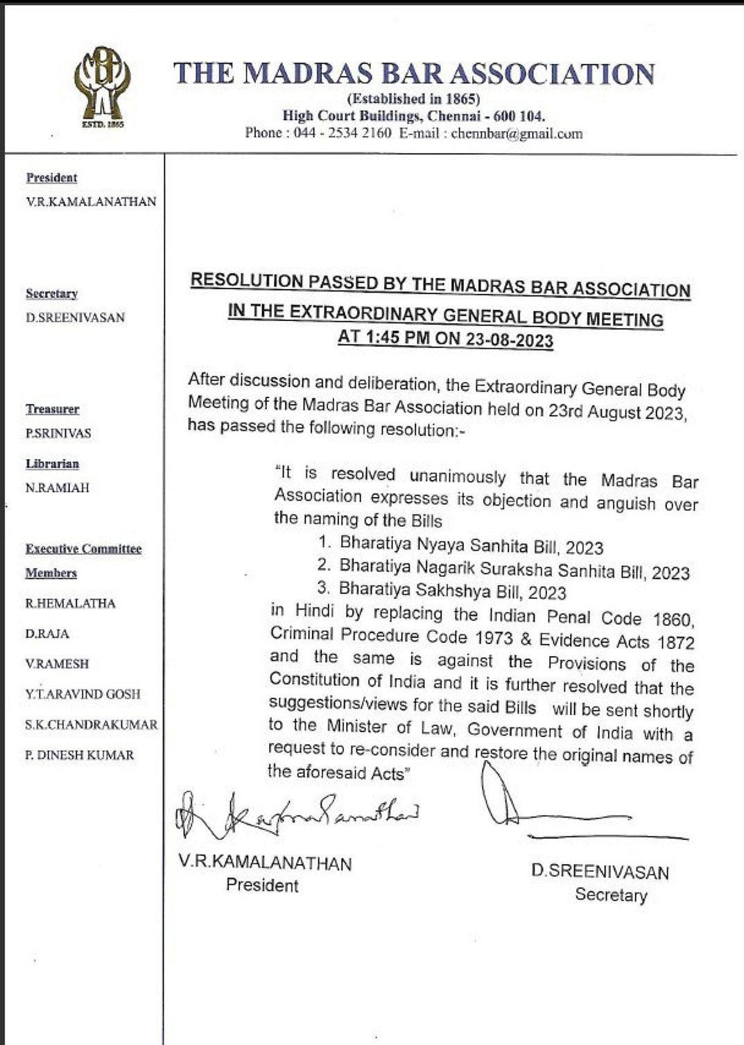 President of the Madras Bar Association VR Kamalanathan and Secretary D Sreenivasan, in their joint statement, stated that after discussion and deliberation, the Extraordinary General Body Meeting of the Madras Bar Association held on Aug 23 has resolved unanimously that the association expresses its objection and anguish over the naming of bills in Hindi.