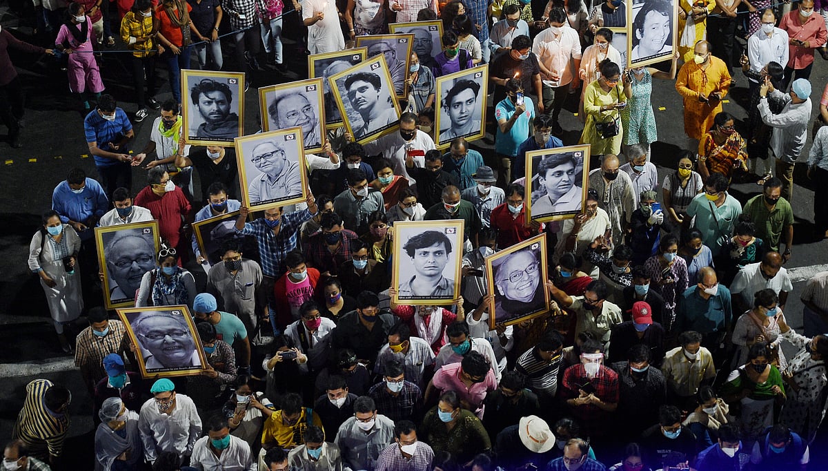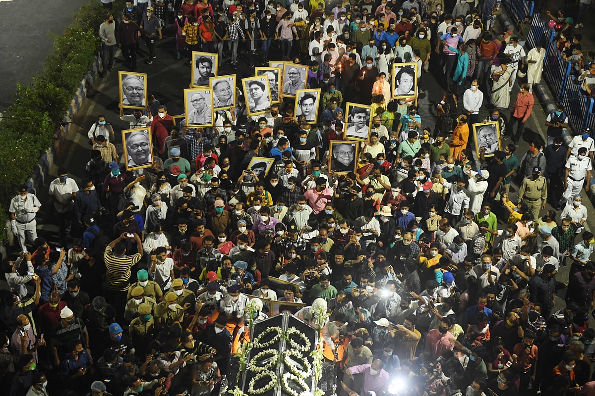 West Bengal Chief Minister Mamata Banerjee, along with her ministerial colleagues and a host of film personalities, walked in the procession with others singing Rabindranath Tagores song, Aguner parashmoni chhoao praane (the touchstone of fire will turn us pure).