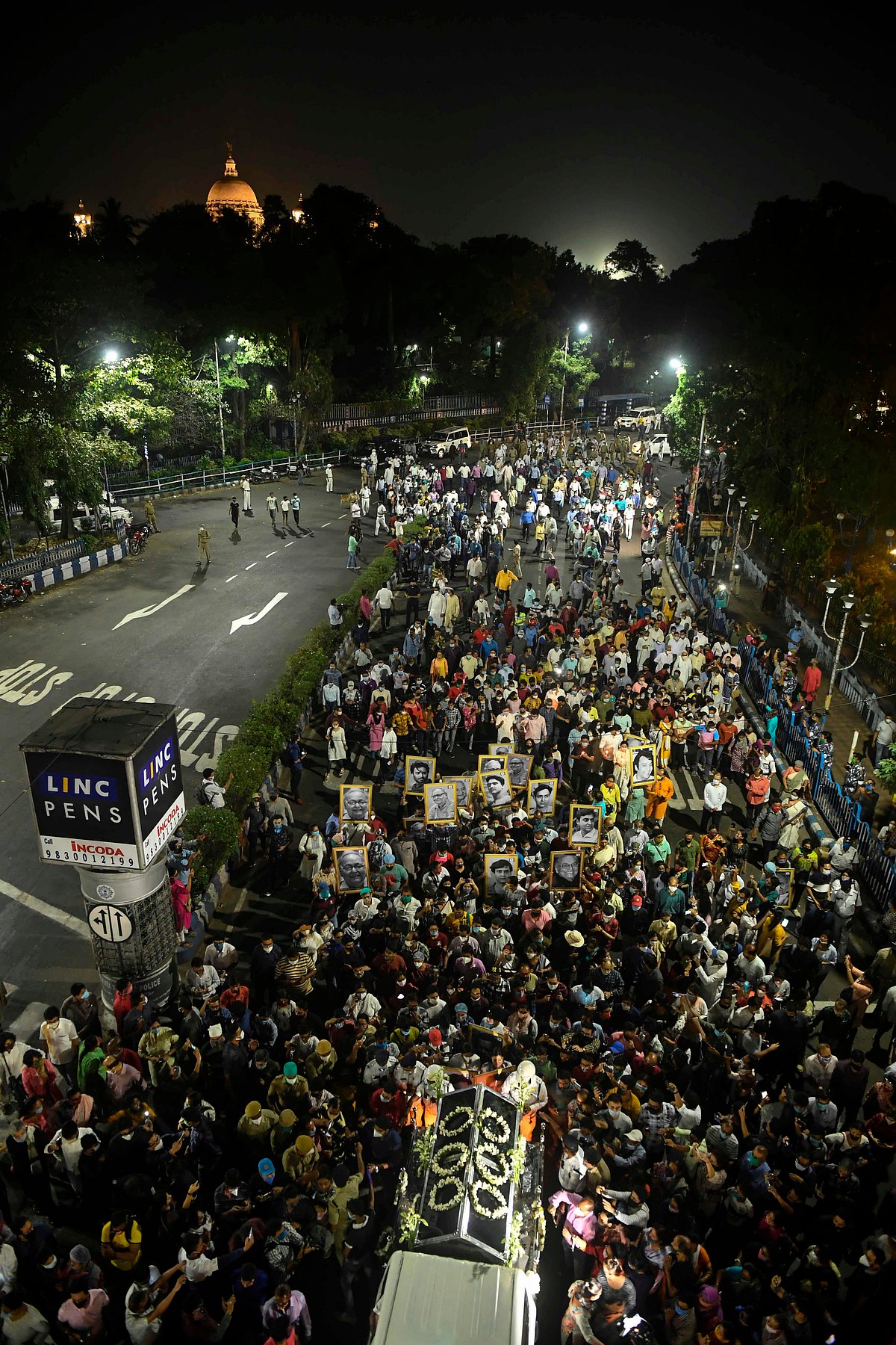 Not just Banerjee and leaders of her party Trinamool Congress, senior CPI(M) leaders such as Biman Bose, Suryakanta Mishra and Sujan Chakraborty also took part in the procession which started from Rabindra Sadan, a government auditorium where Chatterjee's body was kept for some time for people to pay their homage.