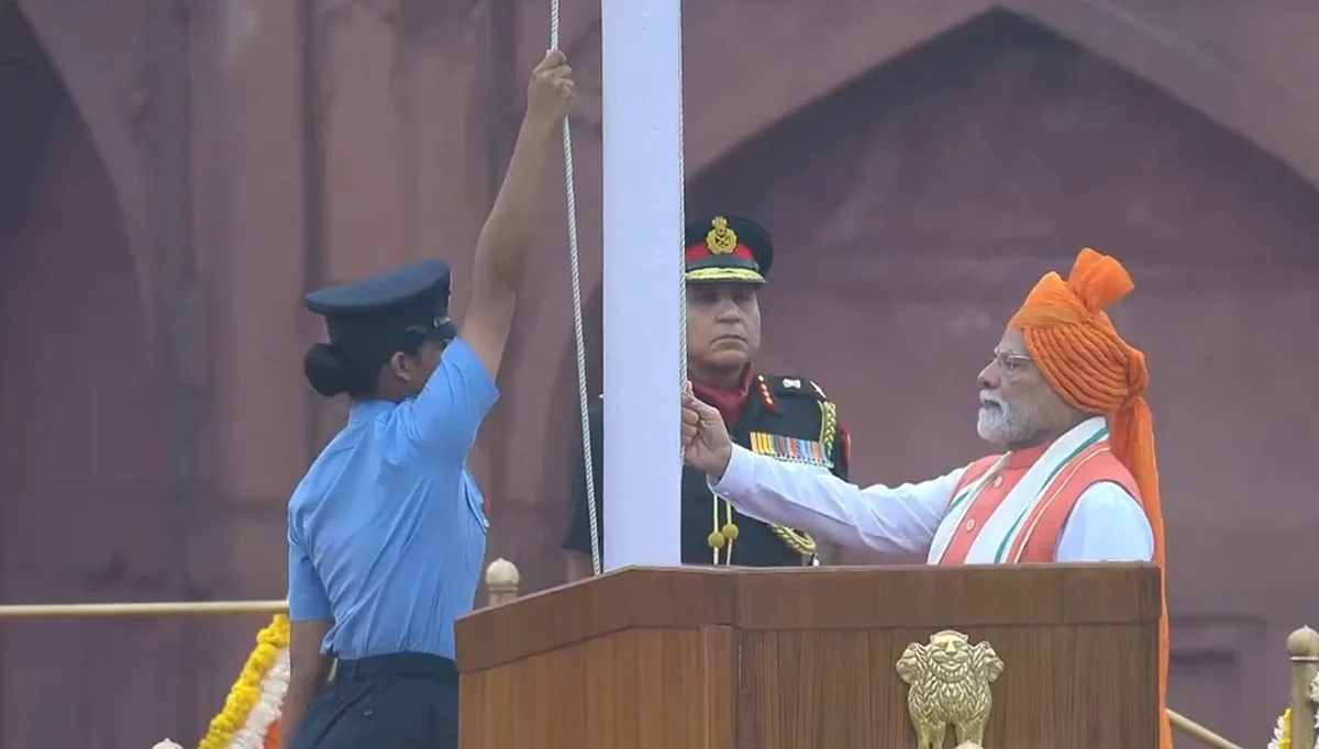 New Delhi: Prime Minister Narendra Modi on Thursday hoisted the tricolour at Red Fort, as the nation marked the celebration of the 79th Independence Day. Flying Officer Rashika Sharma assisted PM Modi in hoisting the flag.