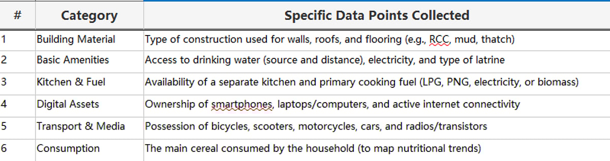 The information gathered during this phase is purely functional and focussed on "Housing & Household Assets." The following table highlights the primary categories of data collection: