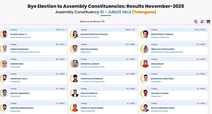 Hyderabad: Congress candidate Naveen Yadav was marginally ahead of his BRS rival Maganti Sunita as per initial trends of counting of votes in the by-election to Jubilee Hills assembly constituency here on Friday, according to TV reports.