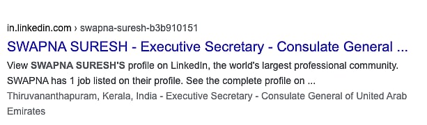 Swapna Suresh is also former employee of the UAE Consulate. If you Google search her name, you can find her LinkedIn profile. However, on clicking it, it appears as if she has put all necessary filters to ensure a third-party cannot see her profile details. However, her Facebook profile, which is open, had her last post, dated in April. This hasn’t stopped people flooding her timeline to troll her about the scandal in the past few hours.