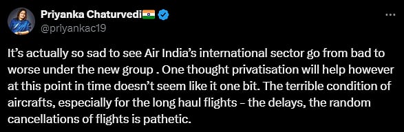 Shiv Sena UBT MP Priyanka Chaturvedi also commented on the 'terrible" condition of the Air India plane. In a post on X, she said, "It’s actually so sad to see Air India’s international sector go from bad to worse under the new group . One thought privatisation will help however at this point in time doesn’t seem like it one bit. The terrible condition of aircrafts, especially for the long haul flights - the delays, the random cancellations of flights is pathetic."
