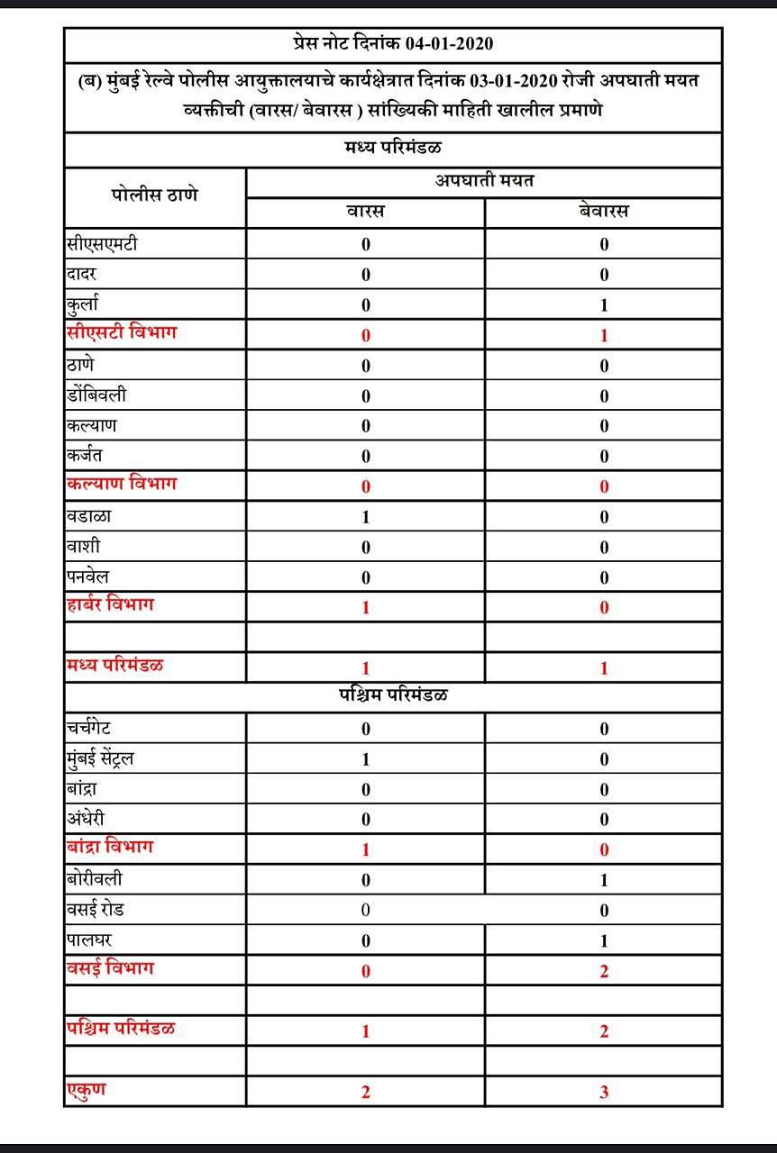 According to a release from Mumbai Railways, five passengers died on Jan 3 2020.