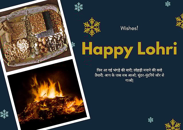 "मूंगफली, तिल और गुड लाए आपके जीवन में खुशियाँ,लोहड़ी का प्रकाश कर दे रोशन आप के आने वाले कल को.पॉपकॉर्न की खुशबु, मूंगफली रेबड़ी की बहार,लोहरी का त्यौहार और अपनों का प्यार…थोड़ी सी मस्ती, थोडा प्यार,कुछ दिन पहले से आपको मुबारक होलोहड़ी का त्यौहार, हैप्पी लोहरी"
