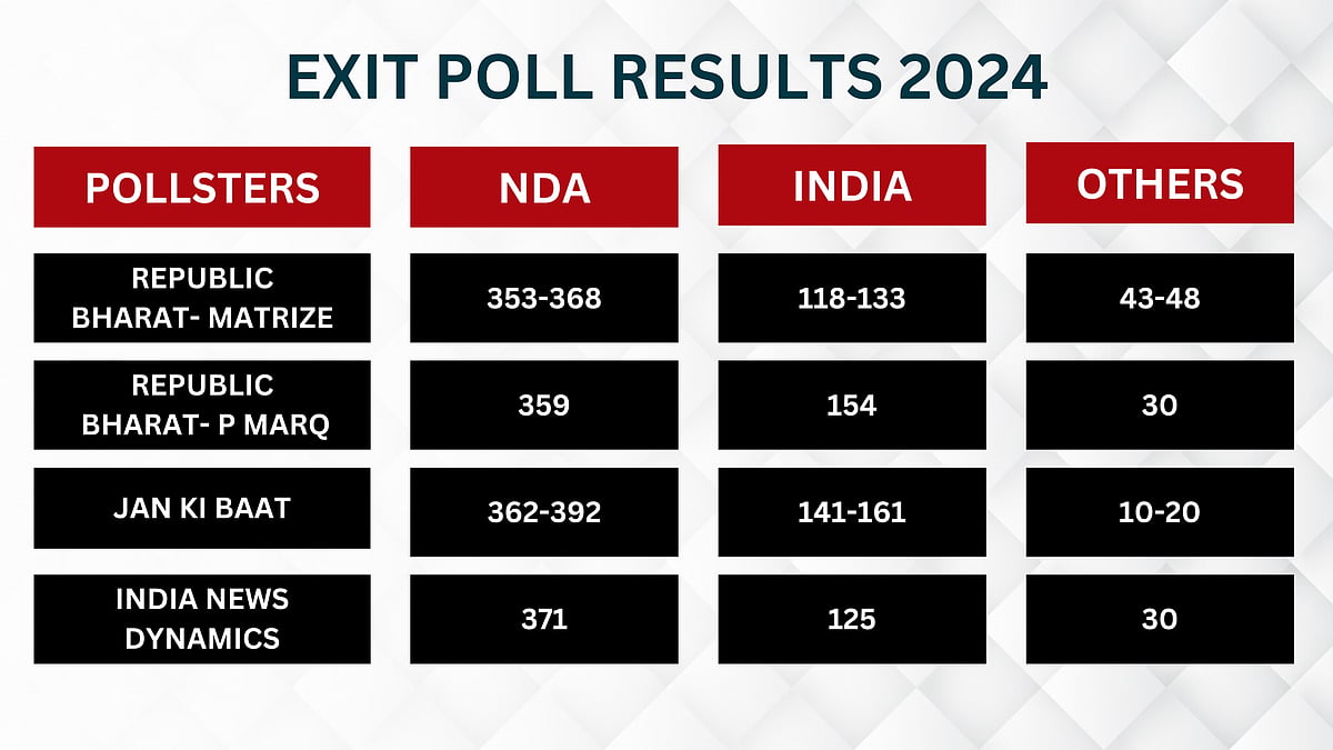- 7:17PM Update: BJP is making a comeback more strongly and Prime Minister Narendra Modi will form the government for the third time in the country. The exit polls have shown that the NDA will clean sweep the Lok Sabha Elections 2024. Here is a table of various pollsters predicting BJP's major win in the elections.