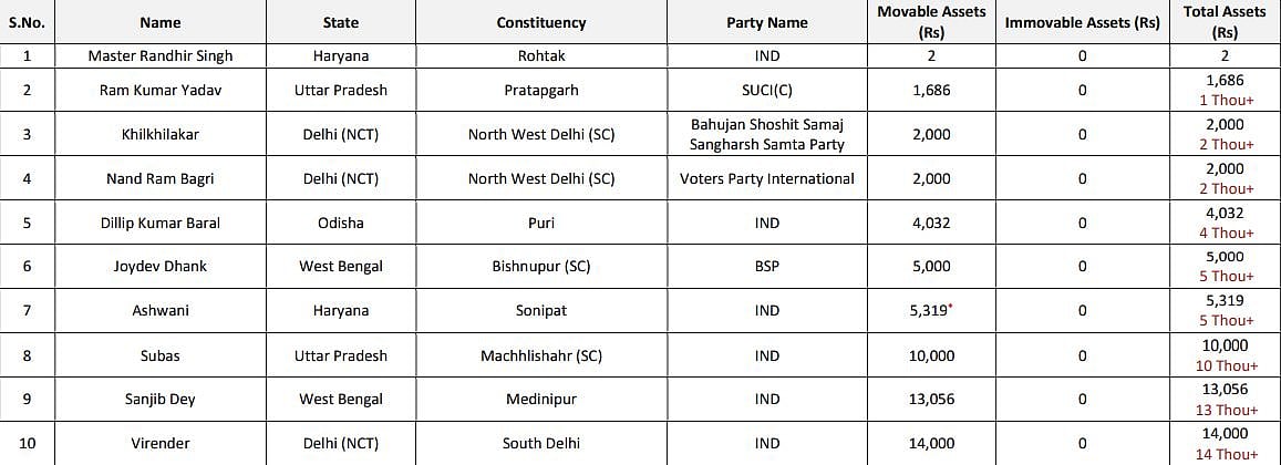 Independent candidate Master Randhir Singh, contesting from the Rohtak constituency in Haryana, has declared the lowest assets in his election affidavit, with just Rs 2. The ADR analysis hasn't revealed the names of candidates who have declared zero assets.