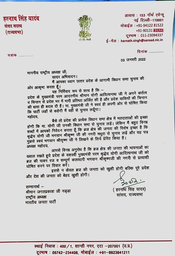 Mathura: BJP Rajya Sabha MP Harnath Singh Yadav has written to party president JP Nadda asking him to declared CM Yogi Adityanath as Chief Ministerial candidate from Mathura constituency, adding, that it will bring joy to people of Mathura.