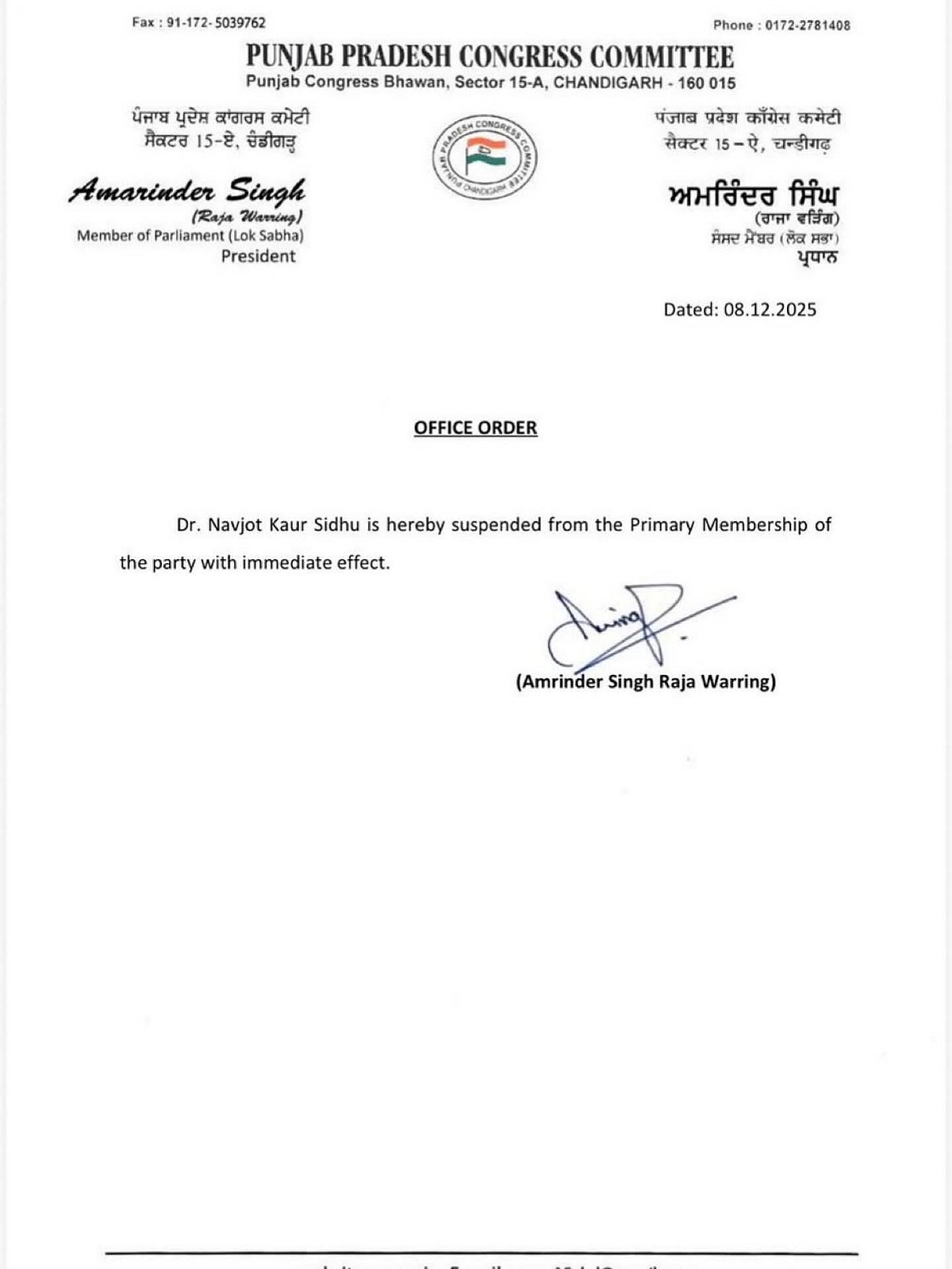 "Dr. Navjot Kaur Sidhu is hereby suspended from the Primary Membership of the party with immediate effect," read an official order of the state unit of the Congress.