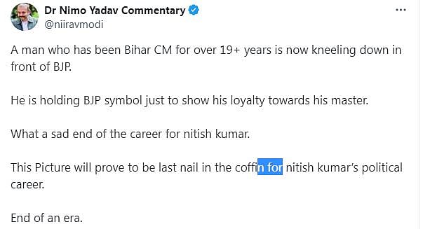 "A man who has been Bihar CM for over 19+ years is now kneeling down in front of BJP. He is holding BJP symbol just to show his loyalty towards his master. What a sad end of the career for nitish kumar. This Picture will prove to be last nail in the coffin for Nitish Kumar’s political career. End of an era."