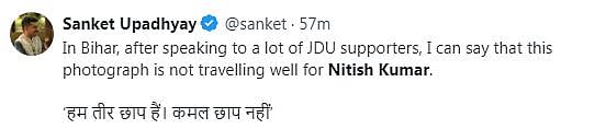 "In Bihar, after speaking to a lot of JDU supporters, I can say that this photograph is not travelling well for Nitish Kumar," wrote journalist Sanket Upadhayay.
