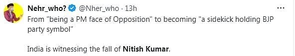 "From 'being a PM face of Opposition' to becoming a sidekick holding BJP party symbol. India is witnessing the fall of Nitish Kumar."