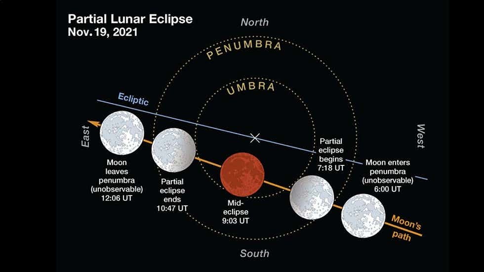 On November 19, the Moon will slip into Earth’s shadow and we can see a partial lunar eclipse and the last lunar eclipse of the year. A partial lunar eclipse occurs when the Earth comes between the Sun and the Moon, but not in a perfect line. A small part of the moon gets covered by the Earth’s shadow and we can see a reddish Moon.