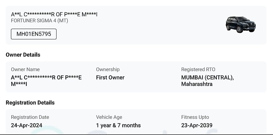 The model of White car is a Fortuner Sigma 4 (MT) and is owned by the Additional Commissioner of Mumbai, according to carInfo. The car is registered with the Mumbai (Central) RTO.