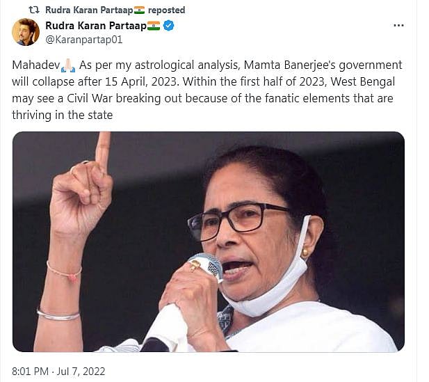 Rudra reportedly predicted that in the 2023 Telangana elections, K Chandrashekhar Rao's incumbent government would be re-elected and continue its tenure. He tweeted this prediction on May 27, 2023, but the tweet has since been deleted.