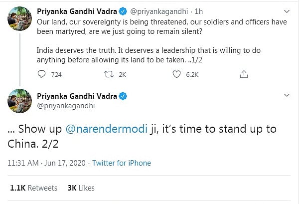 Taking to Twitter, Priyanka Gandhi Vadra wrote: "Our land, our sovereignty is being threatened, our soldiers and officers have been martyred, are we just going to remain silent? India deserves the truth. It deserves a leadership that is willing to do anything before allowing its land to be taken."