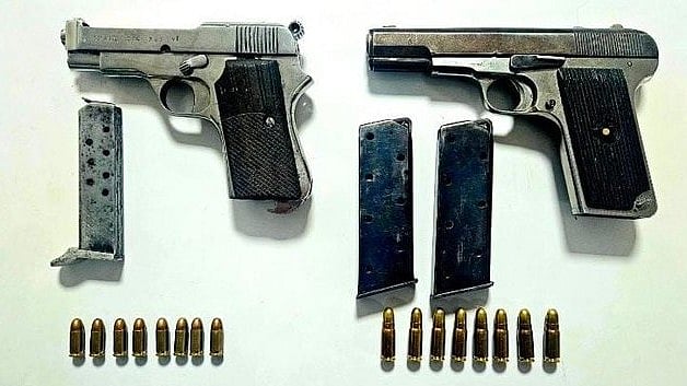 Police said that two illegal pistols a .32-bore pistol and a .30-bore pistol and 10 live cartridges were recovered from their possession. The police have also impounded a motorcycle they were riding.