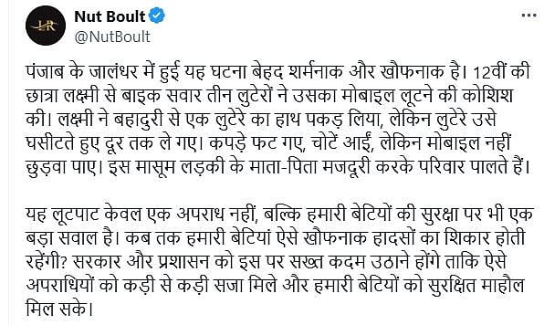“This incident in Jalandhar, Punjab, is very shameful and horrifying. Three bike-borne robbers tried to snatch the mobile phone of Laxmi, a Class XII student. Laxmi bravely caught the hand of one of the robbers, but they dragged her a long distance. Her clothes were torn, and she was injured, but she could not get her phone back," wrote one user.