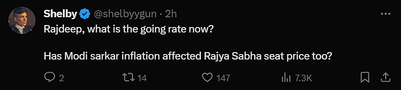 One Twitter user @shelbyygun took it on and said, "Rajdeep, what is the going rate now? Has Modi Sarkar's inflation affected Rajya Sabha seat prices too?"