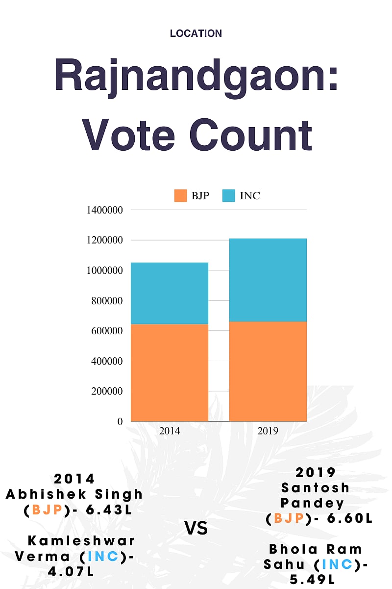 The 2019 edition of the general election was an easy feat for the ruling party in the Rajnandgaon constituency. The saffron party, instead of footing its sitting MP, gave a chance to a new face—Santosh Pandey. Pandey did not disappoint the party, as he won the electoral race against INC's Bholaram Sahu with a margin of 1 lakh votes.