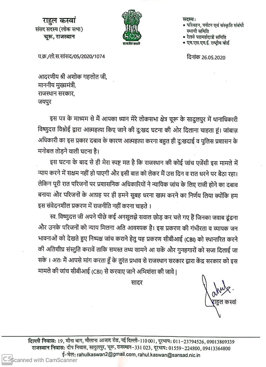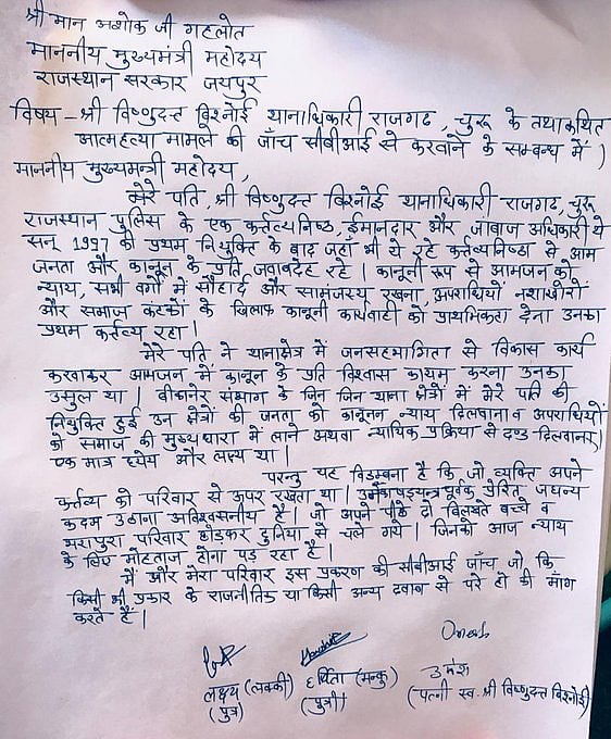Demand for a CBI investigation into the suicide of Vishnu Vishnoi, the Station House Officer (SHO) at Rajgarh in Churu district of Rajasthan is gaining momentum. Vishnu Vishnoi had committed suicide by hanging himself at his official residence on Saturday, May 23. His family has written to the chief minister Ashok Gehlot and demanded that a CBI inquiry be conducted to probe into the reasons behind the suicide. This they said is necessary as to ensure that there is no political or any other form of pressure on the investigators.
