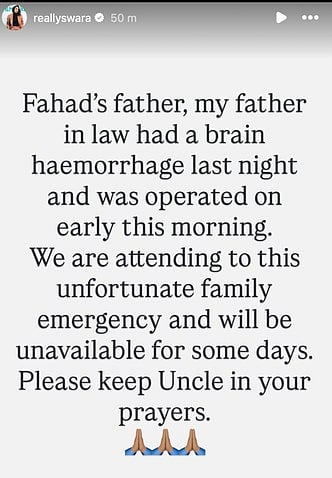 She took to social media and said, “Fahad’s father, my father in law had a brain haemorrhage last night and was operated on early this morning. We are attending to this unfortunate family emergency and will be unavailable for some days. Please keep Uncle in your prayers.”