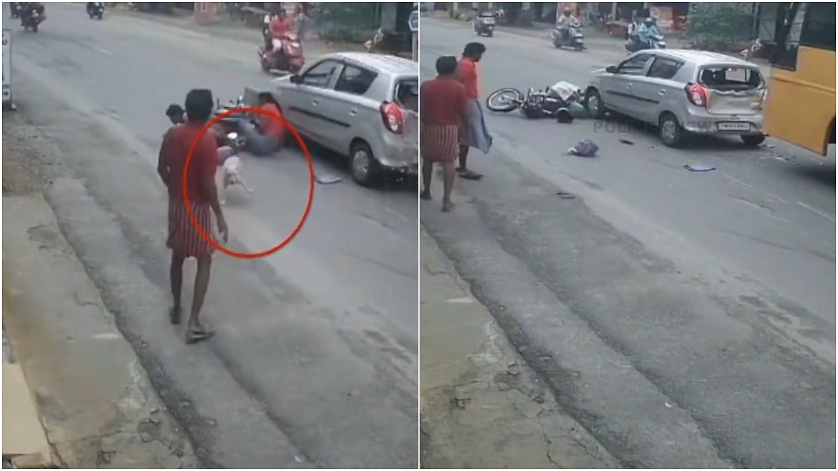 Erode: A shocking incident surfaced in Tamil Nadu's Erode, where two men escaped narrowly with only minor injuries after their two-wheeler hit a dog in the middle of a road on Monday. The incident was recorded on camera, and its video also surfaced online.