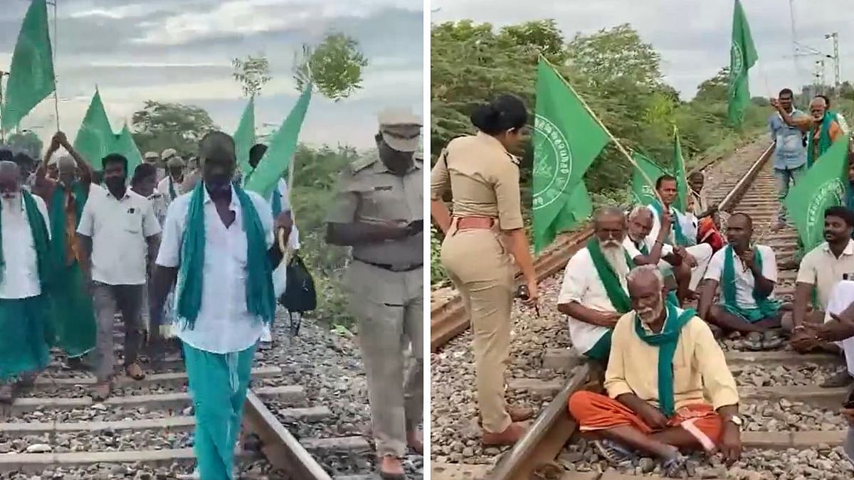 Tiruchirappalli: The National South Indian River Interlinking Farmers Association held a protest on a railway track in Trichy on Sunday (October 1), demanding the release of the Cauvery water in Tamil Nadu. Visuals show members of the farmer association raising slogans and protesting over the Cauvery water issue on a railway track in Trichy.