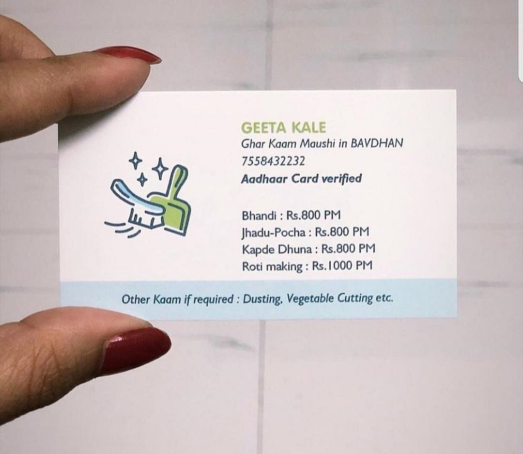 “Ghar Kaam Maushi in Bavdhan; Aadhar Card verified” reads the card. It bears her rates for different kinds of work as well as a footnote that states, “Other Kaam if required: Dusting, Vegetable cutting etc.”