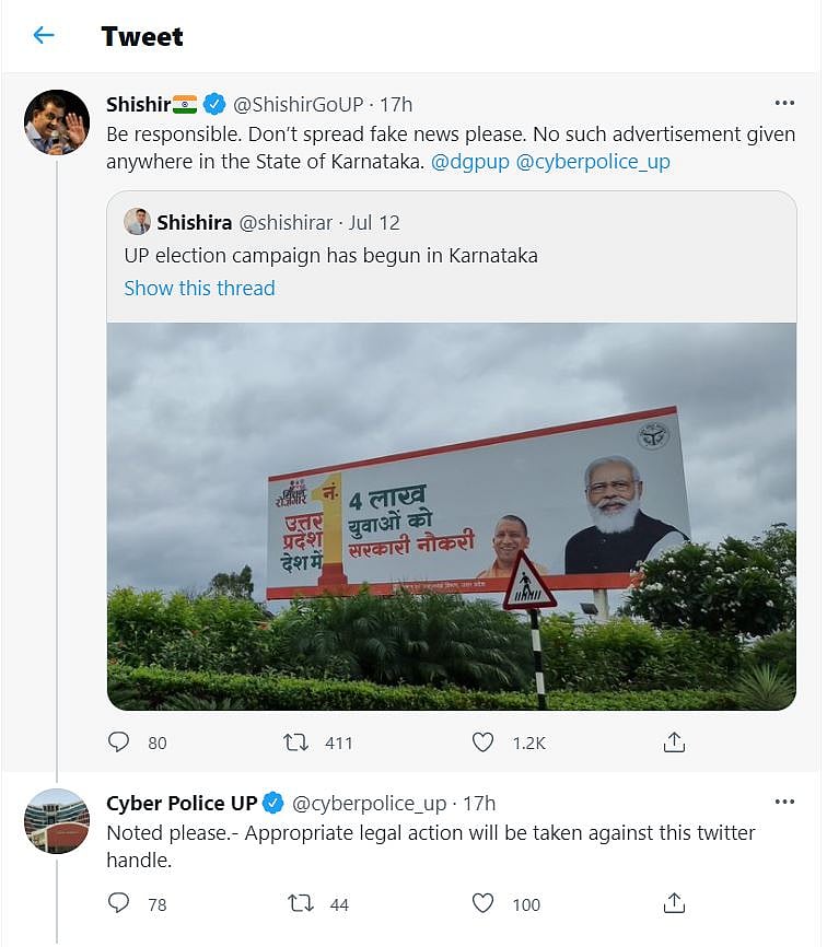 "Be responsible. Don’t spread fake news please. No such advertisement given anywhere in the State of Karnataka," criticised IAS officer Shishir. He is incidentally the director of Information and Public relations, and Culture for the government of Uttar Pradesh. In his tweet he also tagged the UP Cyber Police and the state DGP.