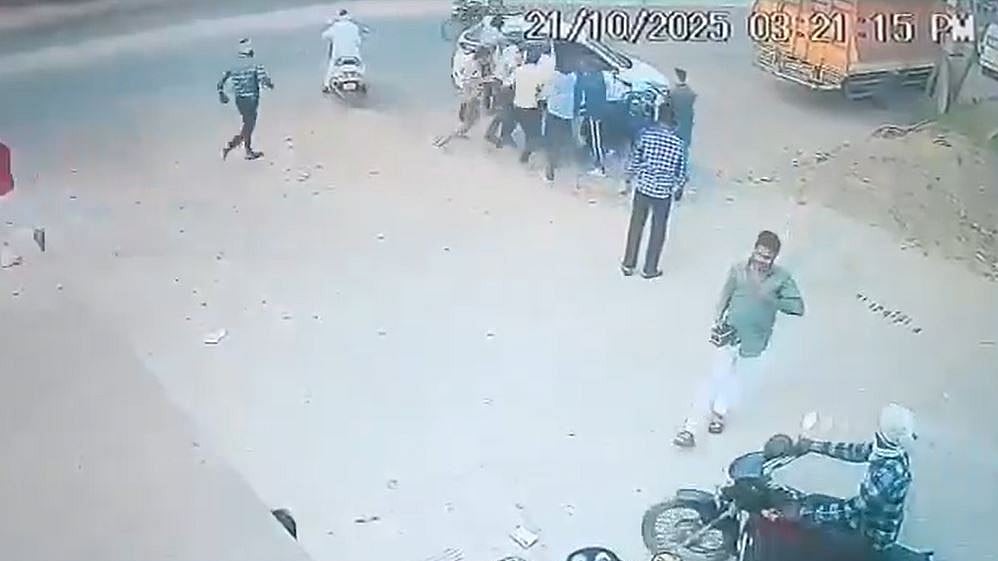 The entire incident was captured on CCTV. The footage shows the youth speaking with three or four people when a white car nearly hits them before stopping close by. The startled youth tries to run, but the men quickly get out of the car and overpower him.