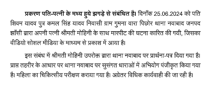 “The case pertains to a fight between husband and wife. On June 25, Yadav, a resident of Nawabad assaulted his wife Mohini, video of which has come to light through social media. In this regard, an application has been given by Mohini above at Nawabad police station,” said Jhansi police.