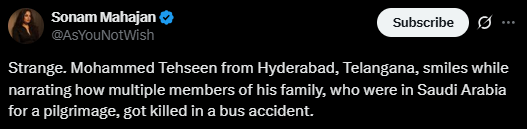 Hyderabad: A video of Hyderabad resident Muhammad Tahseen, who lost his family members and relatives in the fatal bus accident in Saudi Arabia that killed 42 Indians, drew suspicious and critical reactions on social media.