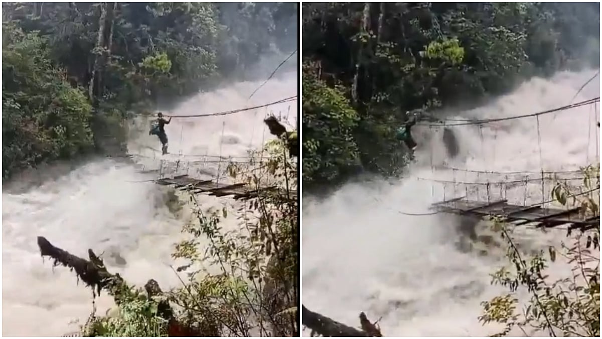 Union Parliamentary Affairs Minister Kiren Rijiju also shared the 45-second clip on his official X handle. In the video, the man could be seen crossing the heavily flooded river with the help of a 'traditional hanging bridged' which seemed to be damaged due to floods.