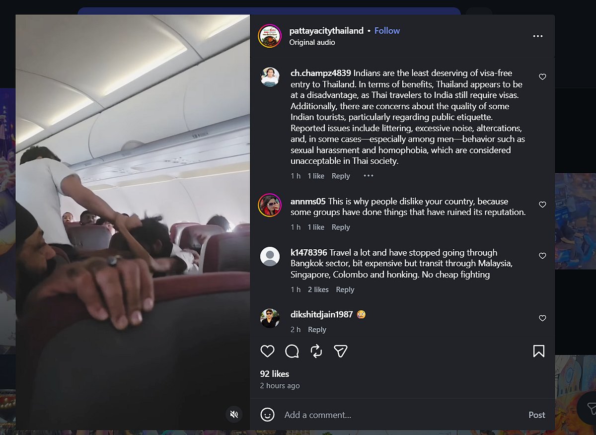 One user wrote on Instagram: “Indians are the least deserving of visa-free entry to Thailand. In terms of benefits, Thailand appears to be at a disadvantage, as Thai travellers to India still require visas. Additionally, there are concerns about the quality of some Indian tourists, particularly regarding public etiquette. Reported issues include littering, excessive noise, altercations, and, in some cases, especially among men, behaviour such as sexual harassment and homophobia, which are considered unacceptable in Thai society.”