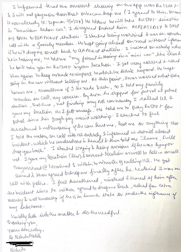 She further said, "Omit my handwriting, I hope you understand you’re not safe travelling alone even in one of the most safest city in the country that too taking an airport cab;my fault? just wanting to reach home asap without having doubts on the cab driver’s intentions SAVDHAN RAHEIN,SATARK RAHEIN"